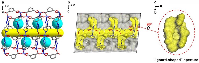 在国家自然科学基金项目(批准号:21731002,21975104)等资助下,vwin德赢ac米兰官网李丹教授和陆伟刚教授团队首次提出了一种正交阵列动态筛分新机制,成功合成并制备出一种基于该新筛分机制的金属-有机框架材料(命名为JNU-3)(见图1)。JNU-3材料呈现三维网格结构,沿着晶体学a轴是4.5Å× 5.3 Å的一维通道,一维通道两侧具有排列整齐的分子口袋,且分子口袋和一维通道之间以一个约3.7 Å的动态“葫芦形”窗口进行相连。混合物丙烯和丙烷可以在一维通道中快速扩散,而分子口袋则通过“葫芦形”窗口选择性地捕获丙烯分子,从而获得最佳的丙烯/丙烷分离效果,即每公斤JNU-3可得到53.5升聚合级纯(99.5 %)的丙烯。研究人员通过原位单晶衍射和分子模拟,进一步解析了丙烯/丙烷分子与JNU-3材料之间的分子相互作用诱导的新筛分机制和动态过程,相关研究成果在《自然》(Nature)期刊发表。该研究成果不仅为丙烯/丙烷及其它重要气体分子的高效分离提供绿色解决方案,而且也为设计下一代新型分子筛提供了新思路。