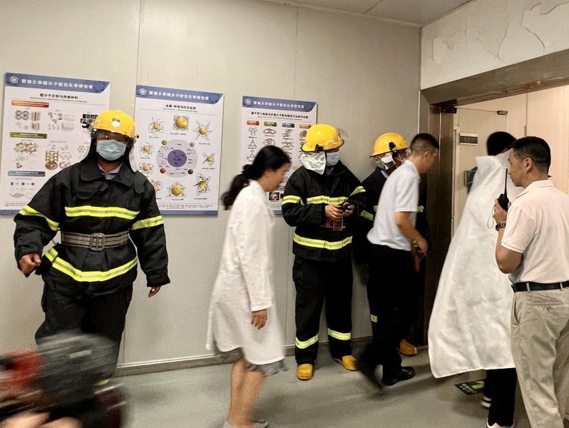 为进一步提升实验室安全管理水平,提高vwin德赢官网师生应对突发事件,特别是实验室安全事故的应急处置能力,9月21日上午,vwin德赢官网联合实验室与设备管理处、保卫处在超分子配位化学研究所开展了实验室安全事故应急演练活动。实验室与设备处副处长饶星、技术安全科科长黄小勇及保卫处刘俊岭科长、庞辉亮科长、吴旭老师等出席本次演练。vwin德赢ac米兰官网院长兼超分子配位化学研究所安全负责人李丹、副院长兼实验室安全负责人周小平、实验中心常务副主任周艳晖、副主任廖小建以及超配所师生80余人参加了演练。
