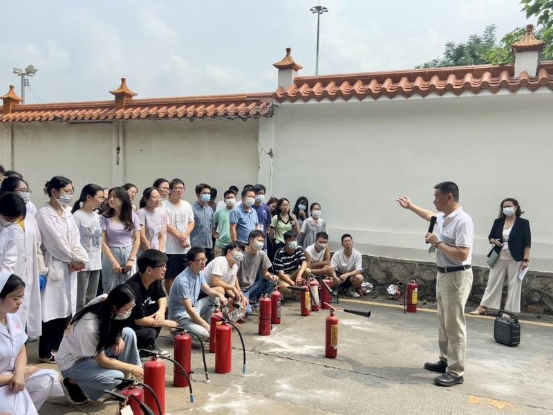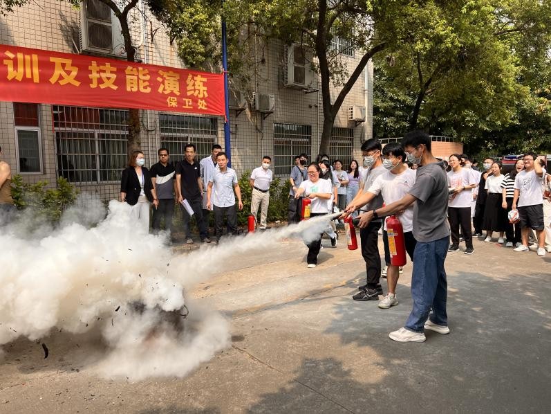 所有人员疏散到安全区域之后,护理学院王欢和程洪涛两位志愿者为现场师生讲解心肺复苏等急救知识、保卫办消防技术人员演示了如何正确使用逃生面罩及灭火器,到场师生认真学习。演示后,在培训人员的指导下,师生们进行了逃生面罩试戴和模拟火灾灭火演习,现场组织严密,学员认真,秩序井然。