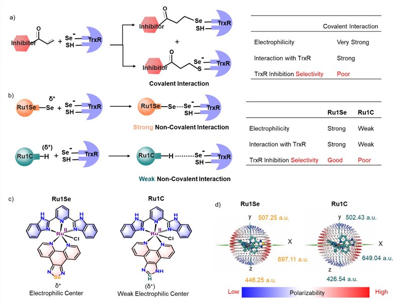 图2 (a)已报道TrxR抑制剂的共价结合抑制模式;(b)硒原子亲电中心的强非共价结合抑制模式;(c)本工作中的金属药物;(d)所设计金属药物的极化性质计算结果