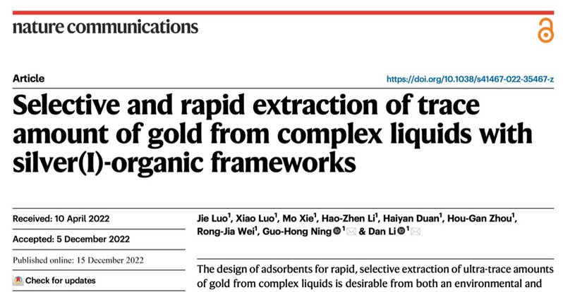 近日,vwin德赢ac米兰官网宁国宏/李丹教授团队以vwin德赢ac米兰官网为唯一单位于2022年12月15日,在Nature Communications(IF=16.9)上发表了题为 “Selective and rapid extraction of trace amount of gold from complex liquids with silver(I)-organic frameworks” 的重要研究成果(图1)。