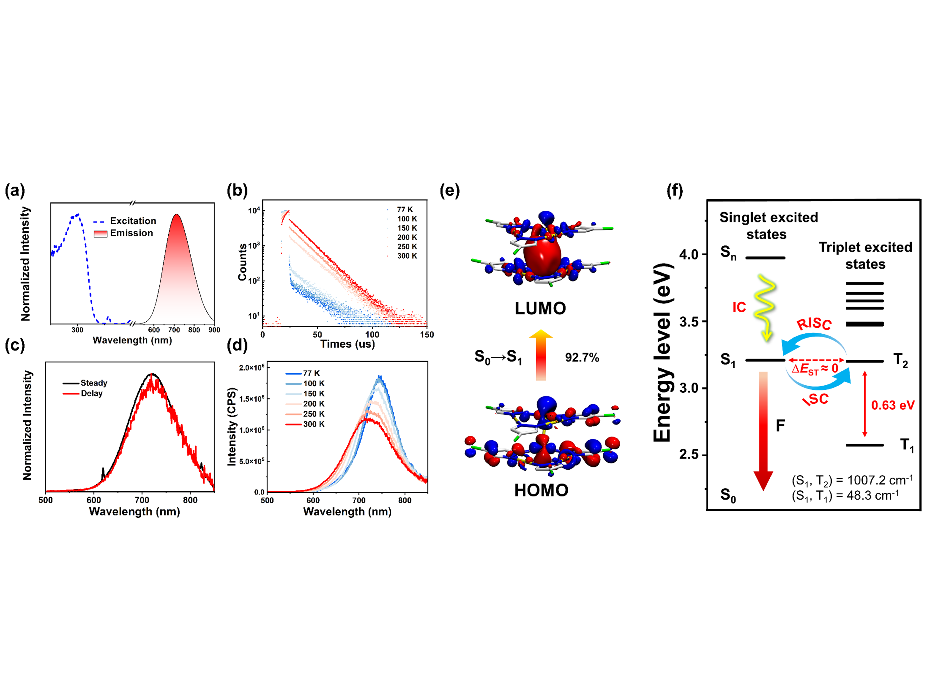 近红外(NIR)发光材料(700~2500 nm)因为在有机发光二极管(OLED)、安全防伪、光动力治疗以及生物成像等领域的应用引起了人们的广泛关注。然而,由于能隙定律以及近红外发射体所需能隙较小,实现高效的近红外发光非常困难,特别是构筑高量子产率(PLQY)近红外热活化延迟荧光(TADF)材料更具挑战。圆偏振发光(CPL)表现出激发态手性,将CPL与TADF相结合将构筑多功能发光材料。虽然CPL-TADF材料自2015年报道以来逐渐增加,但合成具有NIR发射的CPL-TADF材料仍是一大难题。