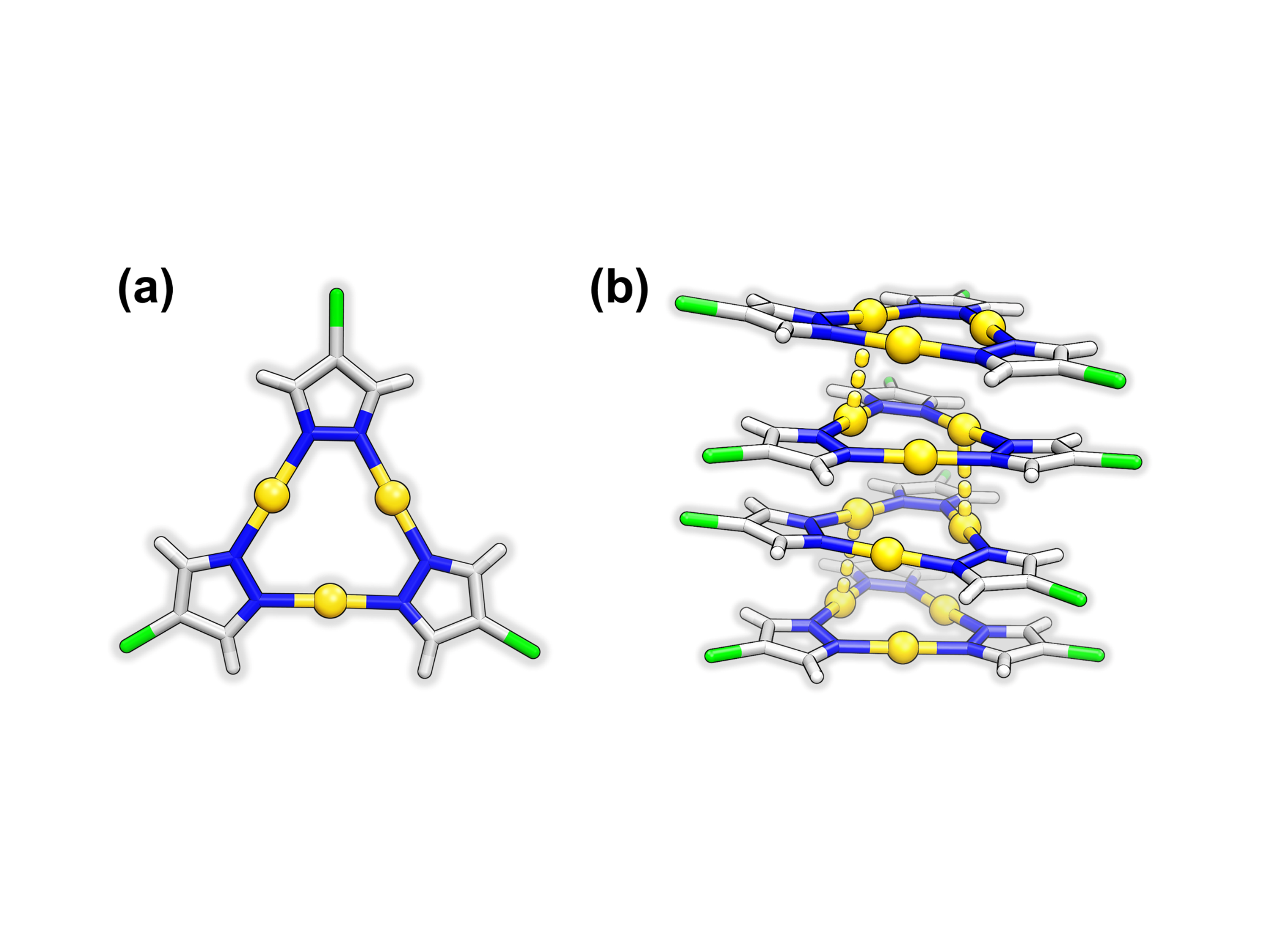 单晶结构分析表明Cl-Au和Br-Au都结晶于非中心对称的Pna21空间群。Cl-Au晶体中相邻的两个CTC分子最短Au···Au距离明显小于Au原子范德华半径之和,表明分子间存在亲金属作用(图2a)。同时,这些作用力也导致CTC分子沿着亲金属作用方向的无限柱状堆积(图2b)。