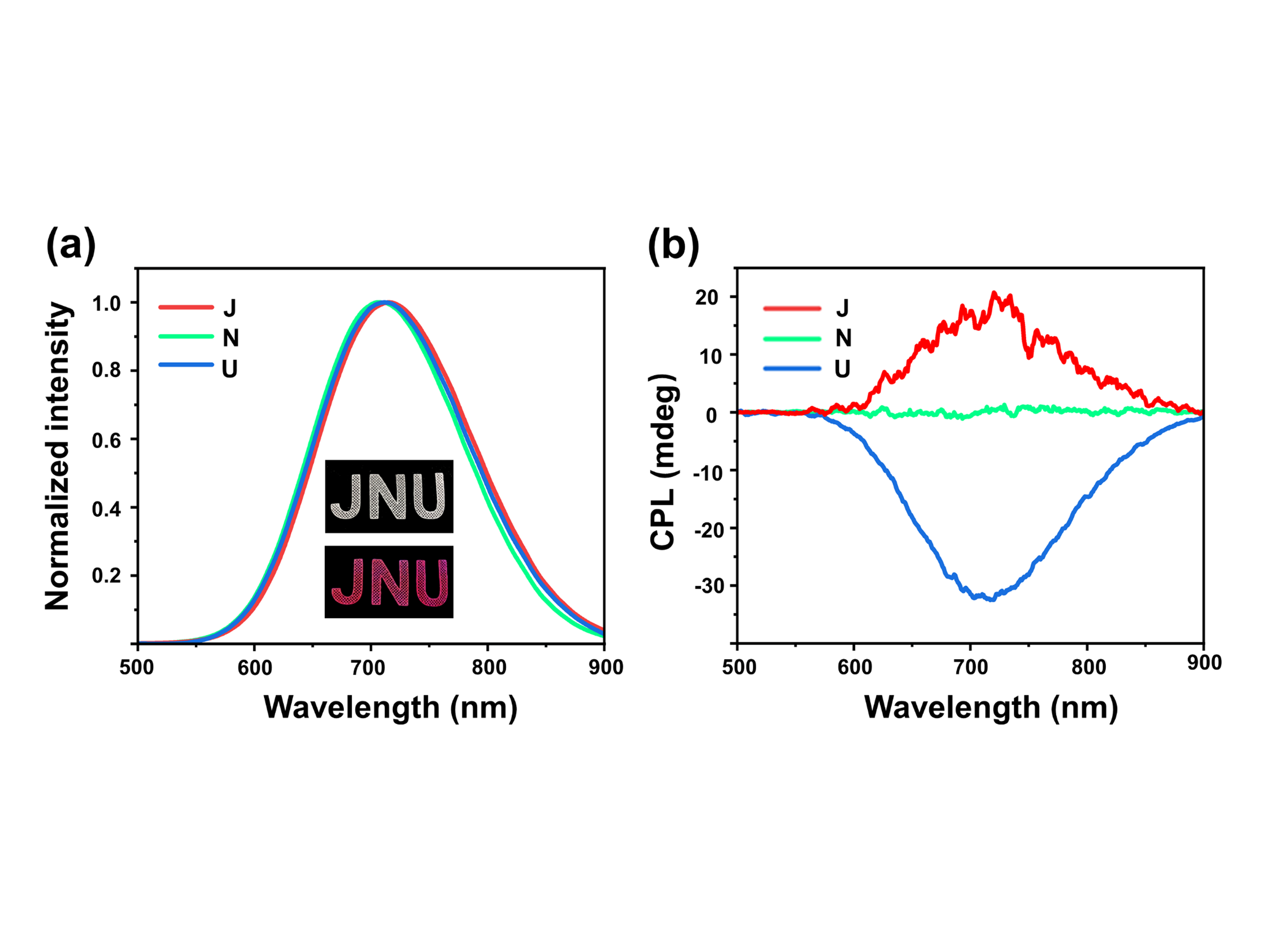 的非手性发光晶体具有手性光学活性的潜力。Cl-Au和Br-Au都结晶于Pna21空间群,表明它们可能存在光学活性。圆二色光谱和CPL光谱测试结果验证了它们具有光学活性。同时还发现已经报道的具有特殊空间群环三核配合物的晶体也具有CPL活性。进一步研究表明晶性对Cl-Au和Br-Au的CPL性能起着关键影响,当用机械力破坏其晶性后,样品的CPL信号也随着消失。利用晶性调控CPL性能这一特点,将Cl-Au作为发光发光墨水分散在PVA介质中,并结合3D打印技术成功制备了防伪logo。晶性较差的字母N与晶性较好的字母J/U在发射光谱上完全一致(图4a),但在CPL测试中只有J/U存在信号(图4b),从而实现了非手性材料的圆偏振防伪。本工作提供了一种简单且有效的策略来构筑具有CPL-NIR-TADF特点的一价金配合物,这将为先进发光材料的开发提供新思路。