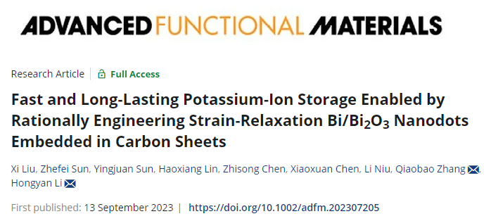 近日,vwin德赢ac米兰官网李宏岩老师课题组在国际著名期刊Advanced Functional Materials(影响因子为19)上发表了题为“Fast and Long-Lasting Potassium-Ion Storage Enabled by Rationally Engineering Strain-Relaxation Bi/Bi2O3 Nanodots Embedded in Carbon Sheets”的重要研究成果,揭示了合理设计应变-松弛结构对于实现高倍率和长寿命的钾离子电池具有重要作用。vwin德赢ac米兰官网为第一通讯单位。