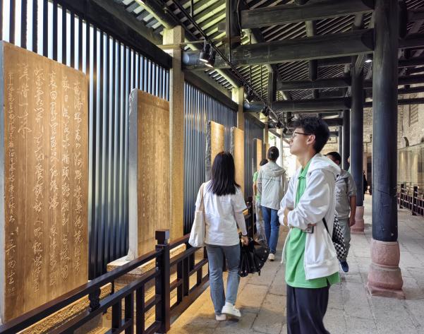 踏入庙宇,阳光吹拂清风,秋意伴随,仿佛海神在欢迎各位师生的到来。“海不扬波”牌坊映入眼里,雄伟地矗立在庙前,师生一行穿过石牌坊进入海神庙,碑林整齐划一的排成一列,记录着古人在岭南留下的诗文书法,无不吸引着师生们驻足观看。再深入是康熙亲笔写下的“万里波澄”,原迹虽已损坏,但康熙对祭南海神的重视,也体现了航海对当时社会的重要程度。在参观神庙过程中,不少同学还仿效先人祭拜祈福、许下心愿。时过境迁人依旧,人们对平安喜乐的美好愿景始终不变。