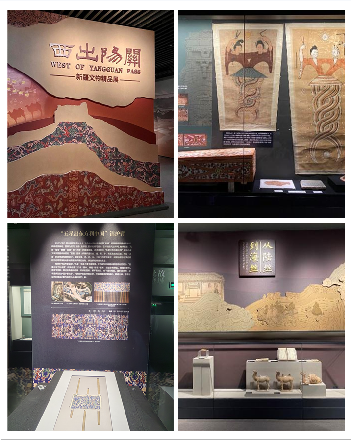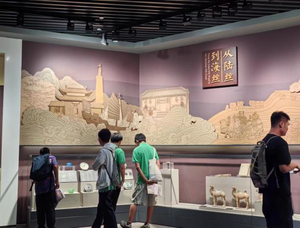 跟着博物馆的展览顺序,同学们首先来到“七海扬帆”展厅。展览从中外航线、造船航海、港口城市、瓷器出口、香药进口、南海神庙国家礼制、市舶制度、佛教海路传播以及蕃商蕃坊等方面,多角度展示了唐宋时期广州海上丝绸之路历史风貌,再现了千年前广州城市繁荣、商业兴盛和文化交融的历史盛况,让同学们学习到广州对外交流的历史,感受到航海文化的魅力。在“西出阳关”展厅,师生们则学习了解了先秦至宋元时期新疆精美的丝绸毛纺织品、珍贵的多民族语言文字的简牍文书、美轮美免的雕塑壁画、奢华的金银珠宝、彩陶、青铜等国家宝藏。一件件文物,诉说着丝路上的动人故事。展览以雄浑壮阔的西域场景氛围,让师生们能够身临其境地感受丝绸之路的繁盛景象。