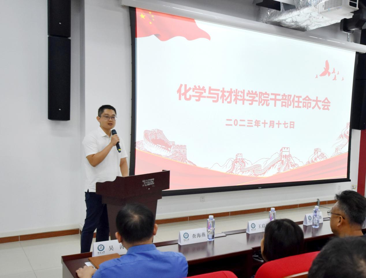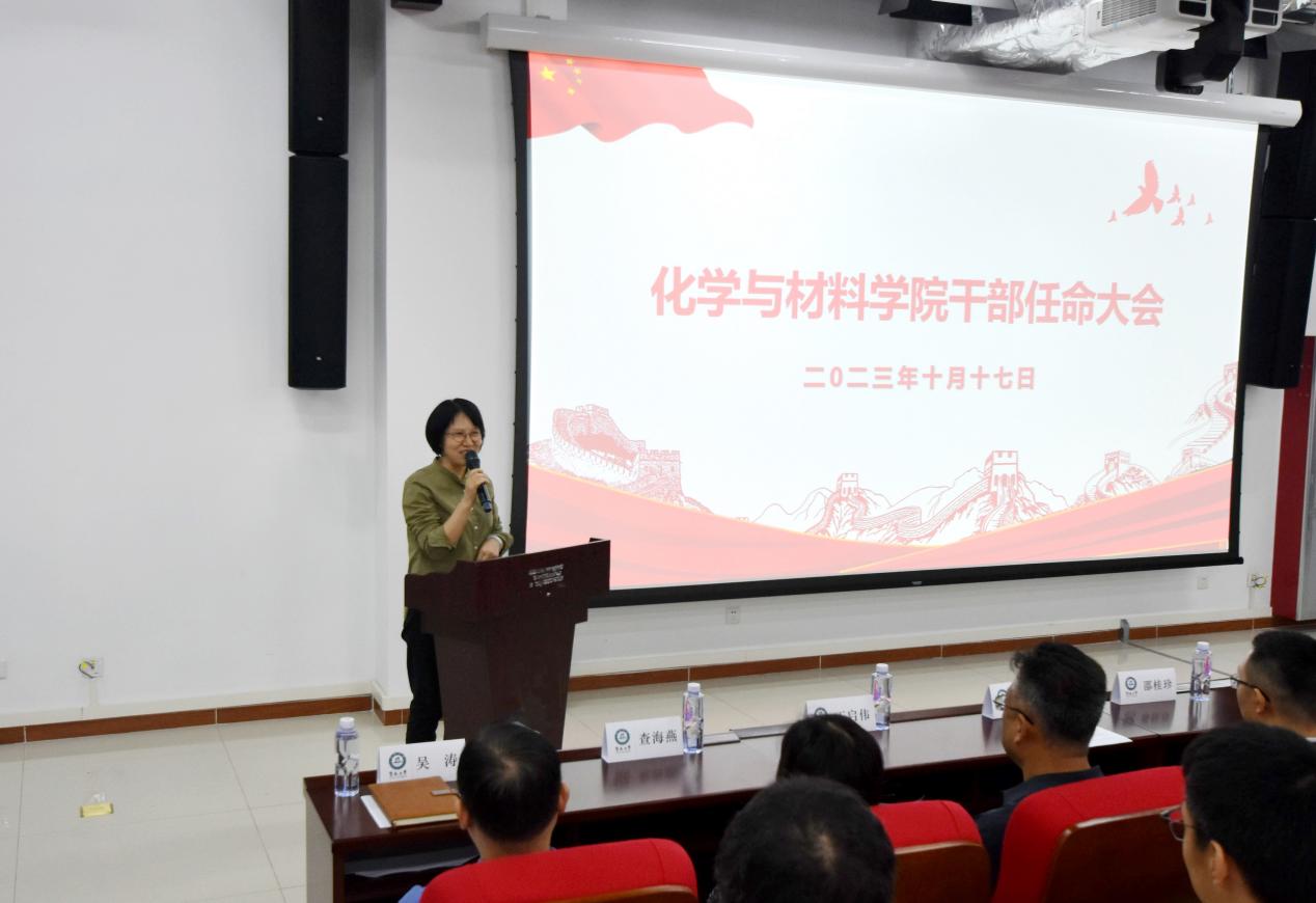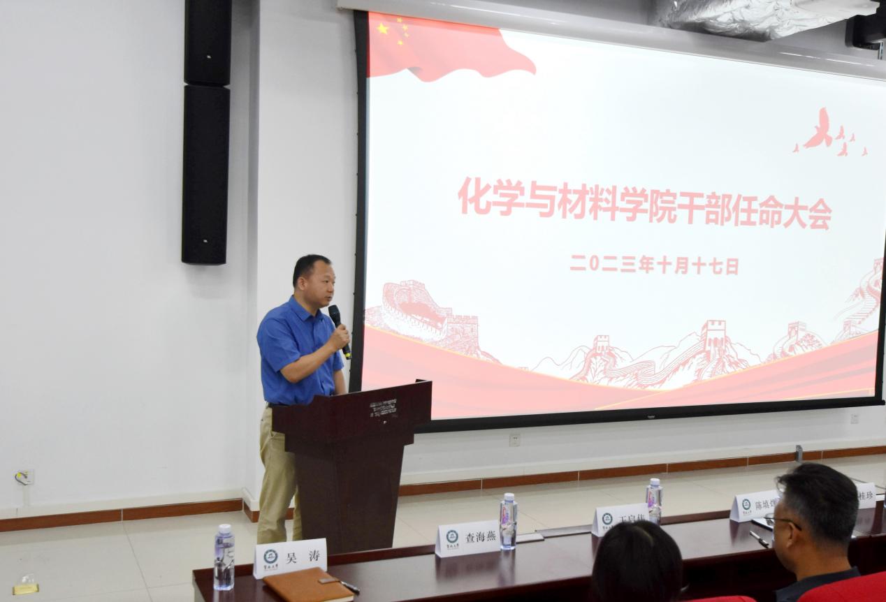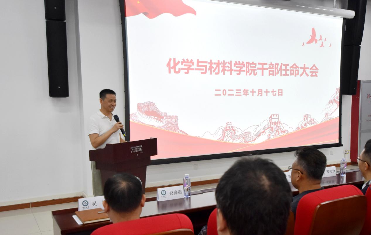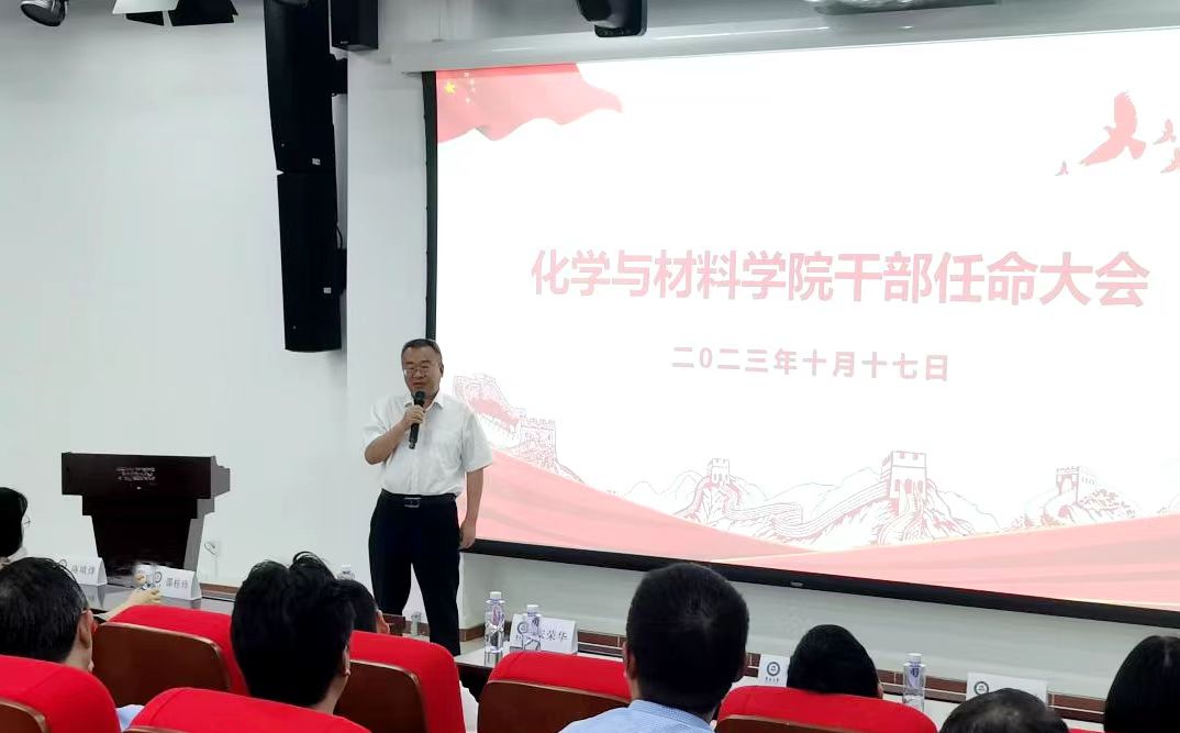 陈龙代表学校党委组织部宣读干部任命文件,经学校党委常委会研究决定,任命陈填烽同志为化学与材料学院院长,吴涛同志为化学与材料学院党委书记;因年龄关系,李丹同志不再担任vwin德赢ac米兰官网院长,邵桂珍同志不再担任vwin德赢ac米兰官网党委书记。
