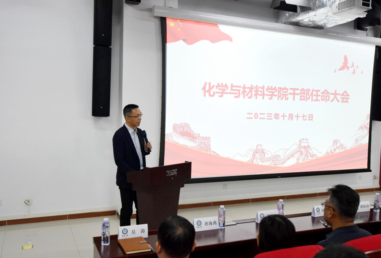 吴涛同志感谢学校党委及校领导、学院领导的培养和信任。他表示,将继续发扬上一届领导班子团结合作、开拓进取的精神面貌,努力为学院的发展谱写新的篇章。作为新一任学院党委书记,他觉得任重而道远,将继续全面贯彻党的教育方针,坚持党的全面领导,始终把党的建设作为化材院工作重心;并将紧密团结学院全体党员同志,发挥党员的先锋模范作用,扎实推进化材院党建工作的创新;还将与全院师生一道,努力把学院建设好,为学校“双一流”建设贡献化材力量。