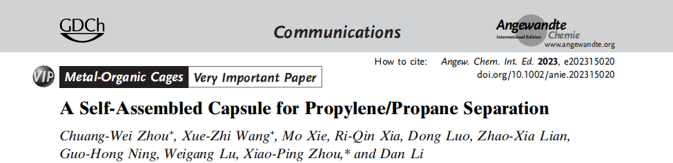 近日,vwin德赢ac米兰官网,超分子配位化学研究所周小平/李丹教授团队在Angew. Chem. Int. Ed.上发表了题为A Self-Assembled Capsule for Propylene/Propane Separation的重要研究成果,并被选为VIP论文(图1)。