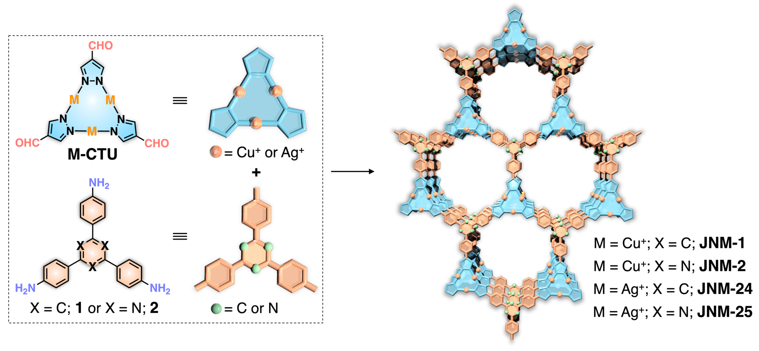 该课题组通过动态共价键连接构建了铸币金属(即Cu、Ag和Au)基环状三核单元(CTUs)的二维(2D)共价金属有机框架(CMOFs)。在之前的工作基础之上(CCS Chem. 2020, 2, 2045–2053;Chem. Sci. 2021, 12, 6280–6286;J. Am. Chem. Soc., 2022, 144, 17487–17495; Angew. Chem. Int. Ed. 2023, 62, e202306497;Nat. Commun., 2024, 15, 194.),我们通过亚胺缩合反应(图2),制备了两种基于Cu-CTU的二维MOFs,分别命名为JNM-1和JNM-2(JNM代表暨南材料),以及两种基于Ag-CTU的二维MOFs,分别命名为JNM-24和JNM-25。(图1)。