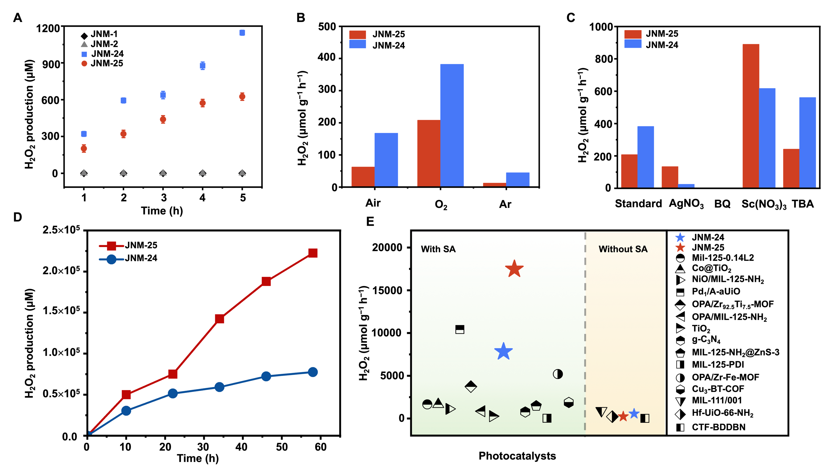 图3. JNMs的光催化性能。(A)JNM-1、JNM-2、JNM-24和JNM-25在催化剂质量浓度为3 mg/5 mL时,在装有λ≥420nm滤光片的300W氙灯照射下,在纯水中光催化生成H2O2的时间过程。(B)JNM-24和JNM-25在不同气体环境下的光催化H2O2生成活性。(C)JNM-24和JNM-25在不同活性材料捕获剂下产生H2O2的效率。(D)JNM-24和JNM-25在IPA存在下的长期光催化H2O2产率。(E)JNM-24和JNM-25与其他代表性材料的H2O2生成效率比较。(A)、(C)和(D)中的实验值是在有O2存在的情况下获得的。