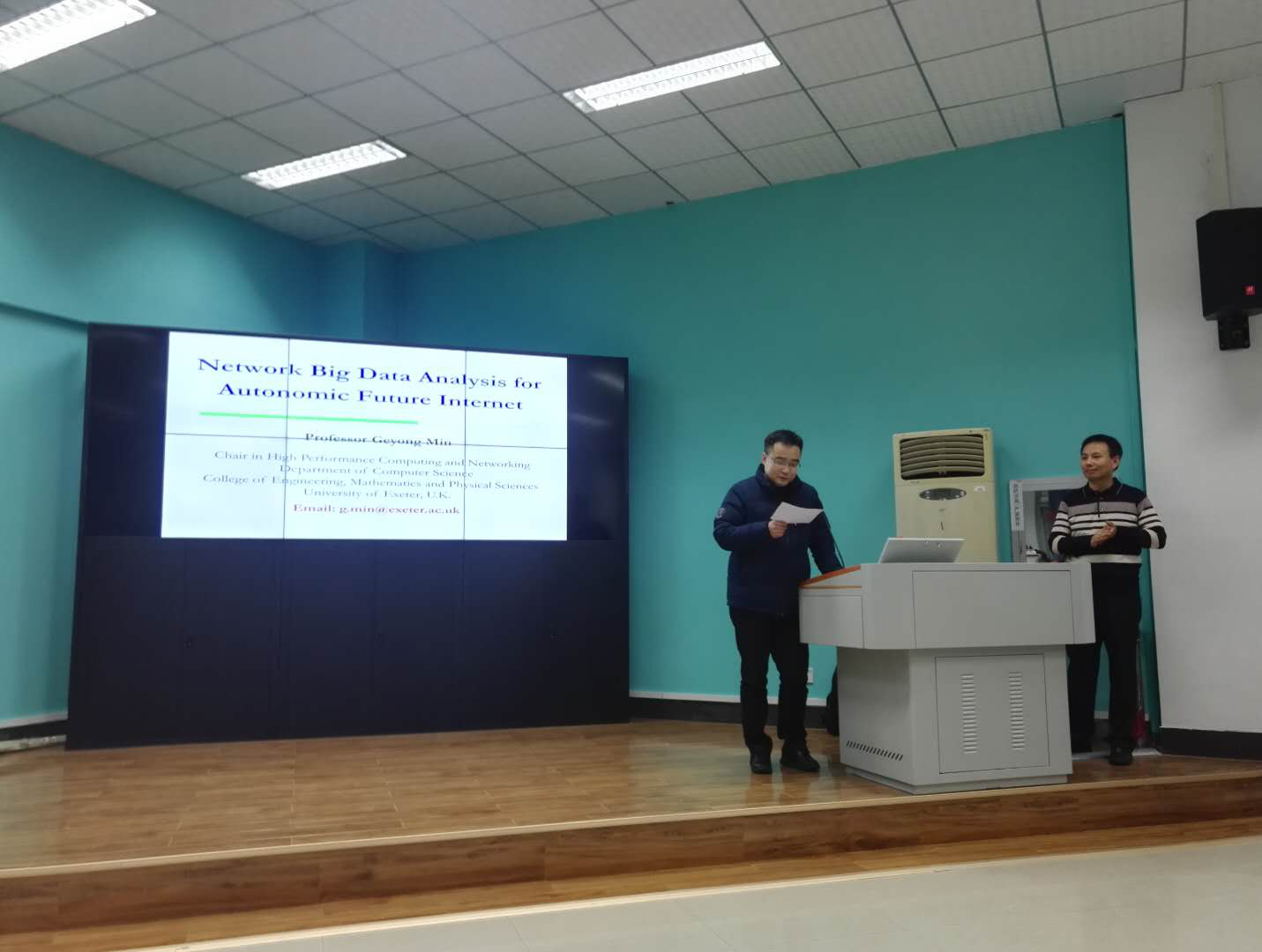 1月2日,应beat365在线唯一官网院长王力哲教授的邀请,英国Exeter大学(计算机学科首席教授)闵革勇教授来院访问,并做了题为“Network Big Data Analysis for Future Intelligent Internet”的学术报告。闵革勇教授在计算机/通信学科的IEEE与ACM国际顶级期刊上发表学术论文140余篇,多次获得会议最佳论文奖,现任6个国际期刊的编委(含计算机学科顶级国际期刊IEEE Transactions on Computers),18个国际期刊专刊的编辑,先后担任了18个国际会议/研讨会的大会主席和程序委员会主席,80多个国际学术会议的程序委员会委员,并在多个国际学术会议与研讨会上做大会特邀主题报告。学术报告在王力哲教授的郑重介绍下正式开始。