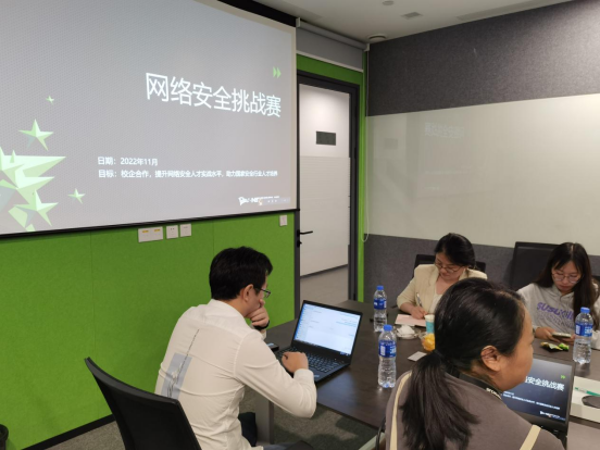 到达绿盟科技有限公司后,绿盟科技产品交付总监舒民对老师同学们表示热烈的欢迎,并带领大家参观了公司主要研发场所。在会议室座谈环节,绿盟研发经理何元基、产教经理彭元、袁帅等人向同学们介绍了公司概况、企业文化和主要项目,并就公司近期即将举办的“网络安全挑战赛”赛制进行了详细介绍。