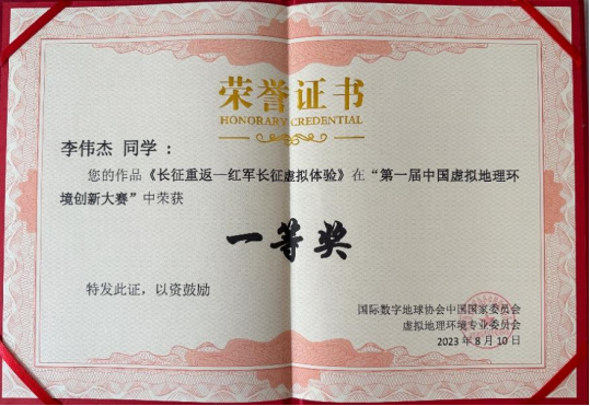 本次竞赛从2023年2月开始到作品提交结束,整个过程历时五个月。李伟杰等五名同学在邱芹军、刘郑和陶留锋三名老师的指导下,查阅了虚拟地理环境的文献资料,师生讨论确实赛道与选题并定期组织会议完成进度,对作品进行反复修改与完善,认真撰写项目实施方案,最终提交了出色的作品,通过专家初审评阅和现场汇报等环节的严格筛选,他们最终脱颖而出,荣获一等奖。他们的杰出表现展现了beat365官网学子的才华,彰显了beat365官网学子在学术和团队合作方面的卓越素养。