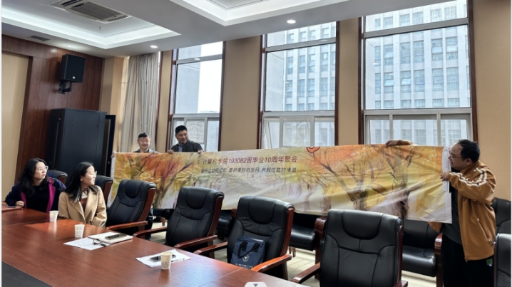 张磊、周骏代表193082班全体同学,向学院捐赠了十周年毕业聚会签名喷绘和一批计算机专业书籍,李国昌代表学院接受捐赠。
