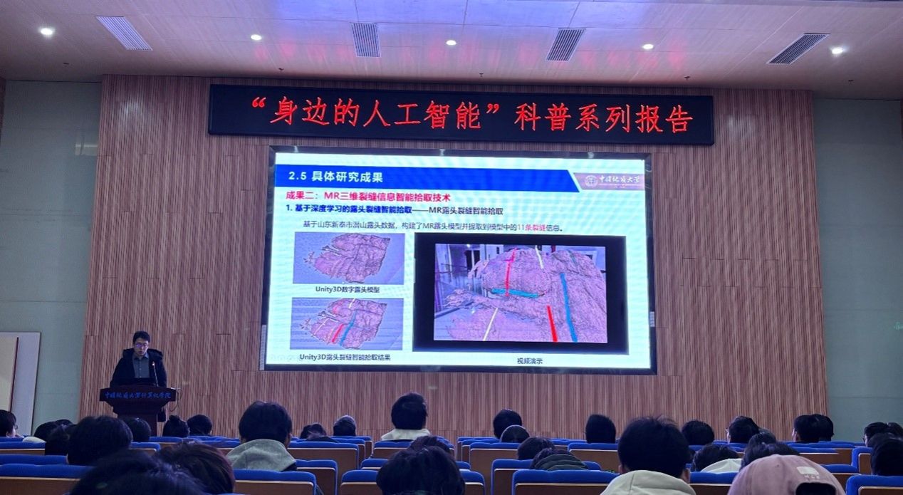 陈麒玉教授报告题目是“MR探索储层裂缝系统”。MR混合现实是让真实物体和虚拟物体实时共存并互动的技术,已经在游戏娱乐、教育培训、能源矿藏等多个领域展现出其独特的应用价值。陈老师向同学们介绍了基于MR的储层裂缝系统表征案例,并用视频演示了MR三维裂缝信息智能拾取、MR三维缝网智能表征等技术。陈教授团队还准备了沉浸式MR头显设备,可供现场师生互动体验。