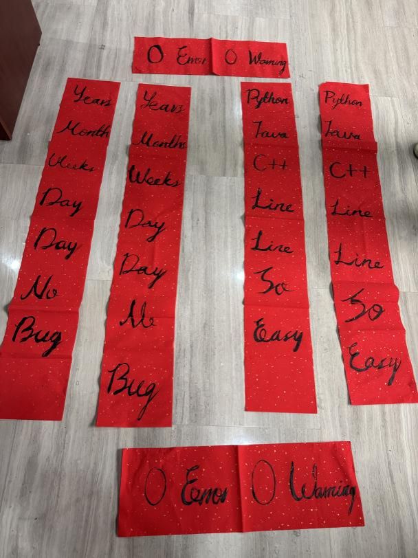 挥毫泼墨,体验书法艺术的妙趣横生! 活动现场,既可以获得书法“大咖”马浩正师兄定制的书法“墨宝”,也可以亲自感受行云流水般的肆意畅快,拿起毛笔,蘸墨挥写,感受笔尖与纸面的亲密接触,一笔一画都传递着书法的力量与美感。同学们也结合专业特色,写下计科人对于新年的美好祝福和祈愿!