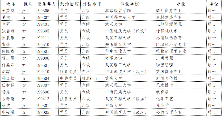 beat365在线唯一官网面向社会公开招聘工作人员已完成对报名人员资格审查,根据优先聘用条件(党员或预备党员+CET6或雅思6.5以上或专业4级以上+硕士)确定参加笔试人员名单如下(排名不分先后):