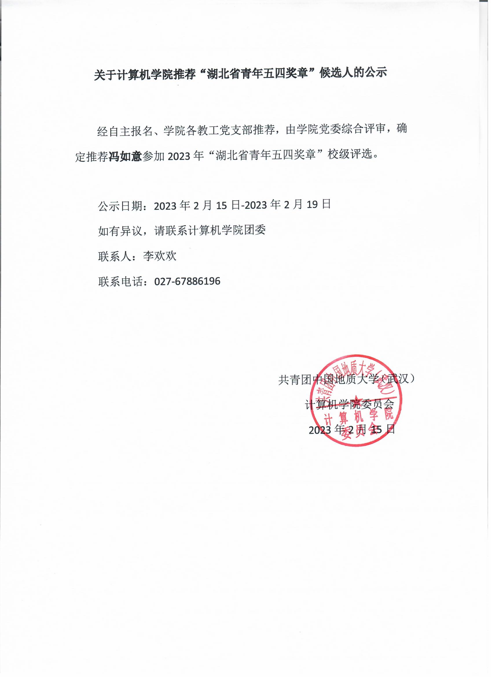 关于beat365在线唯一官网推荐“湖北省青年五四奖章”候选人的公示