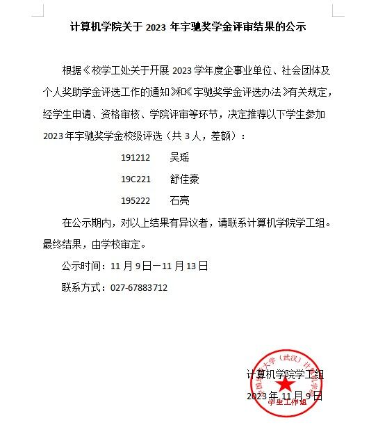 beat365在线唯一官网关于2023年宇驰奖学金评审结果的公示