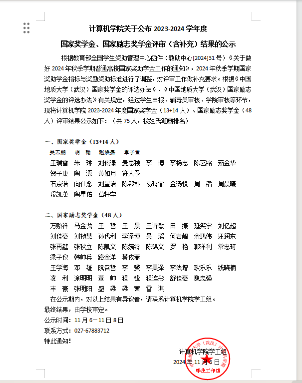 beat365在线唯一官网关于公布2023-2024学年度 国家奖学金、国家励志奖学金评审(含补充)结果的公示