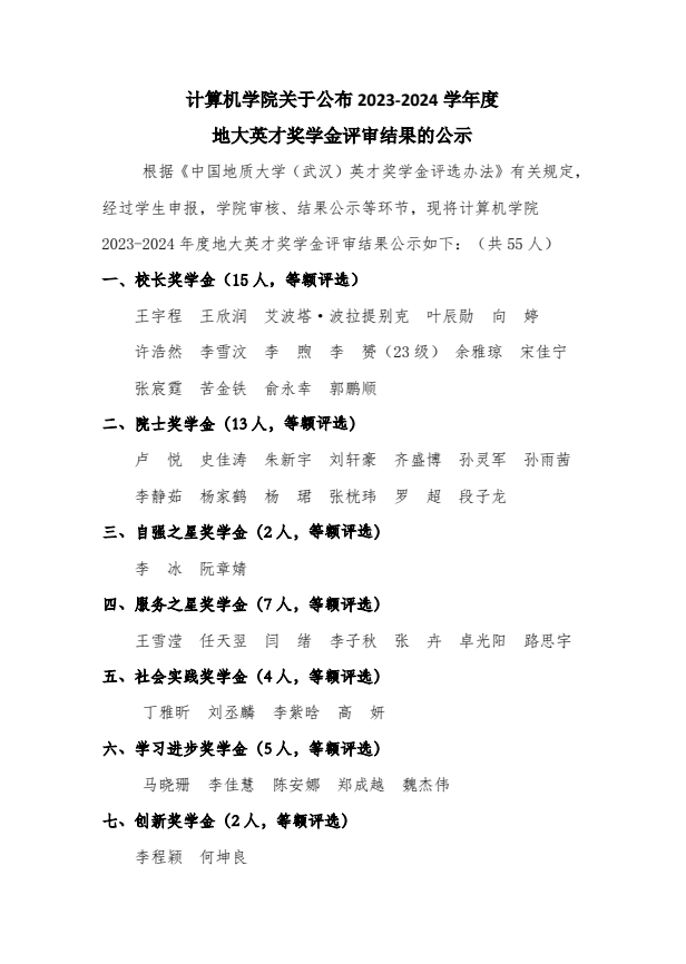 beat365在线唯一官网关于公布2023-2024学年度地大英才奖学金评审结果的公示