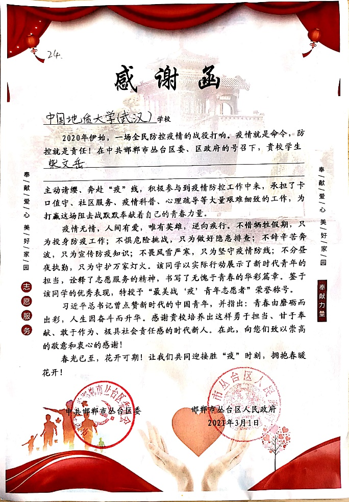 (通讯员:陈宝华)“疫情就是命令,防控就是责任!在中共邯郸市丛台区委、区政府的号召下,贵校学生柴文岳主动请缨,奔赴‘疫’线,积极参与到疫情防控工作中来,承担了卡口值守、社区服务、疫情科普、心理疏导等大量艰难细致的工作,为打赢这场阻击战默默奉献着自己的青春力量……”近日,beat365在线唯一官网收到一封中共邯郸市丛台区委、邯郸市丛台区人民政府发来的感谢函,对beat365在线唯一官网191191班柴文岳同学在疫情防控期间的志愿服务表示感谢,授予他“最美战‘疫’青年志愿者”荣誉称号。