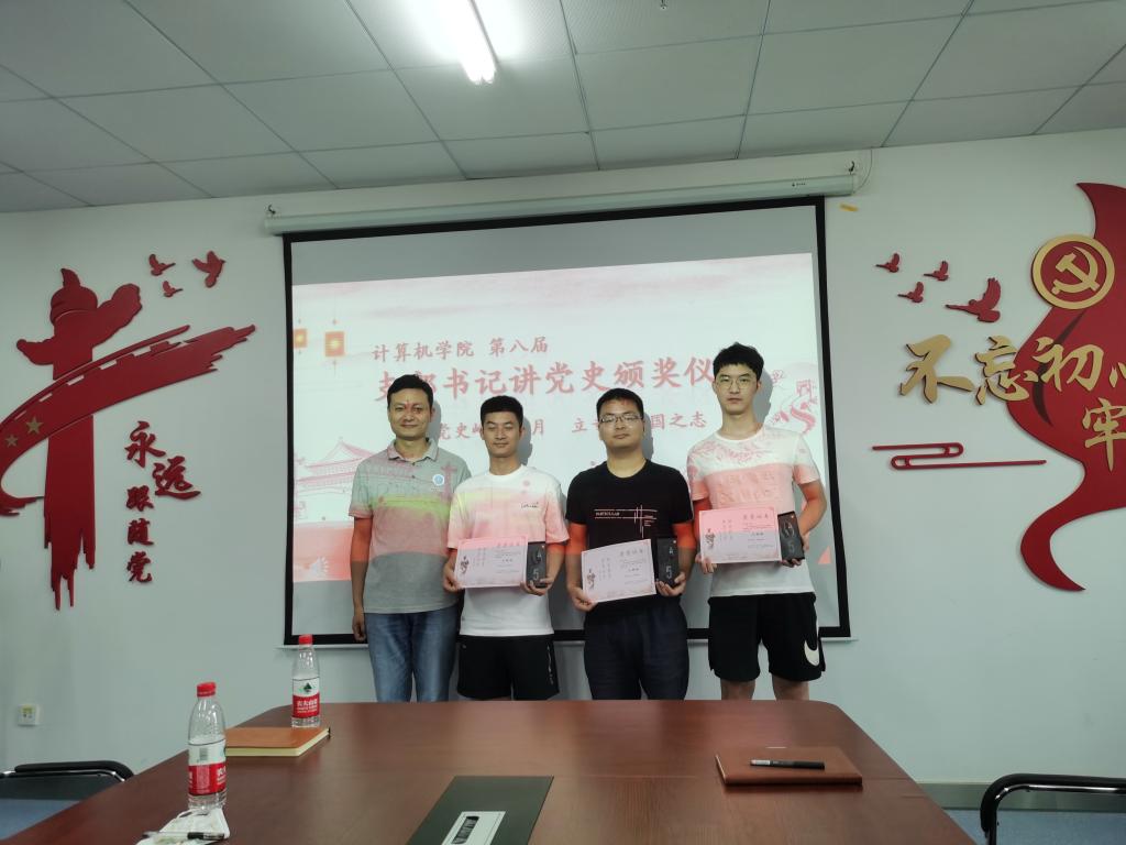 石剑峰为2018级硕士研究生第二党支部支部书记王开、本科生计科第二党支部王子震、博士生党支部甄慧翔颁发三等奖。