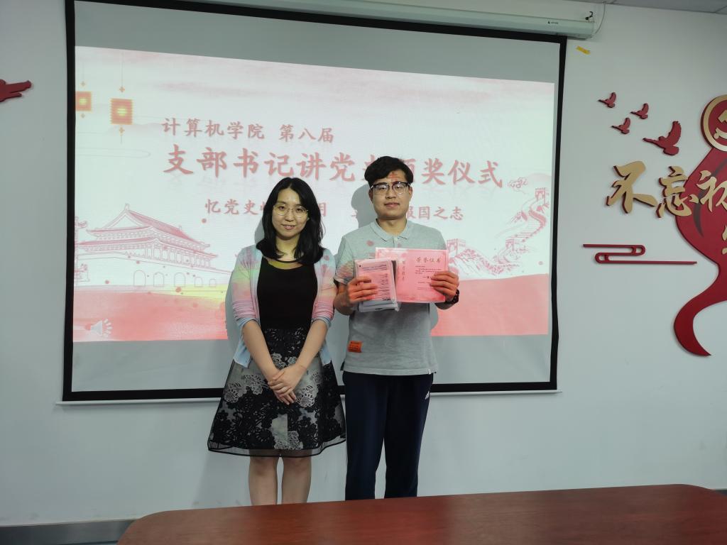仪式开始。王太茂为本科生计科第一党支部支部书记于恩承颁发优胜奖。