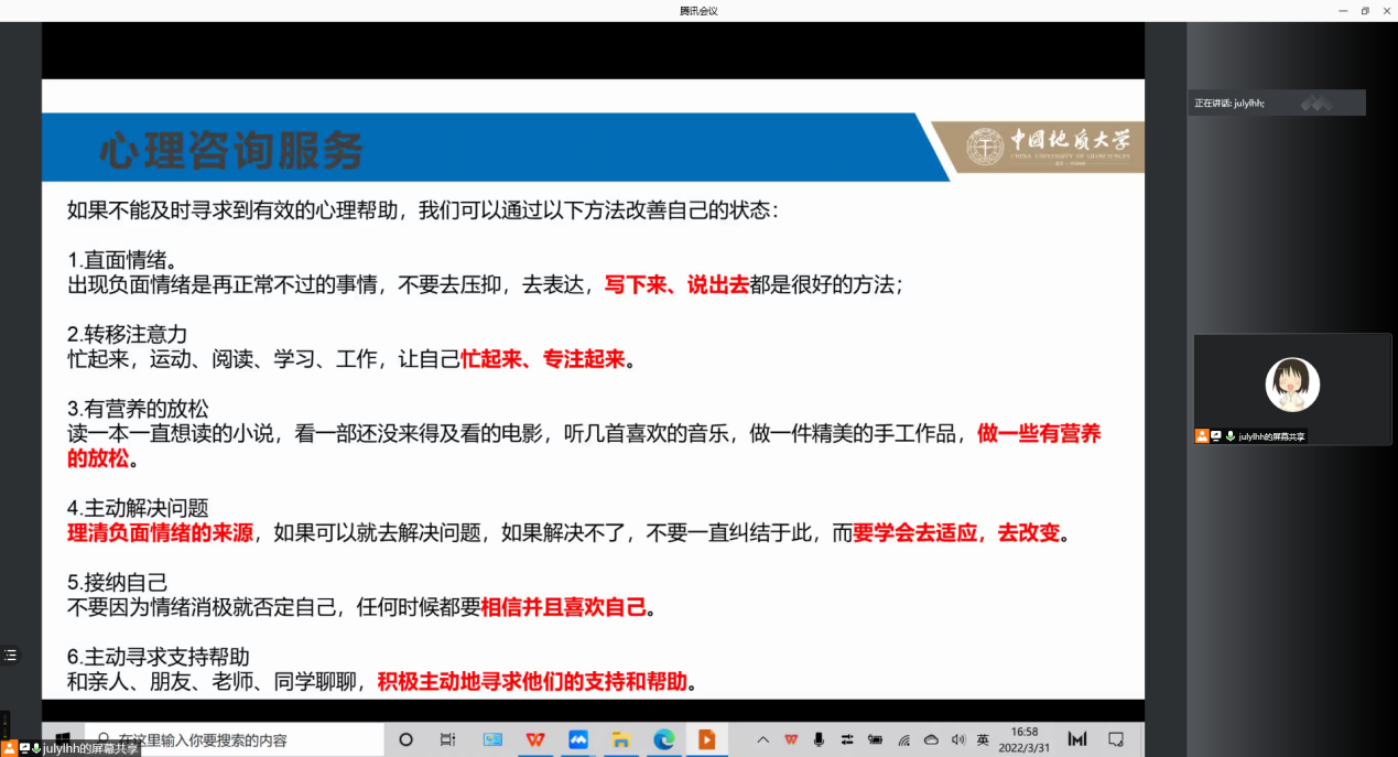 李欢欢就学院日常管理与要求做提醒。首先,她结合当前疫情形势,强调常态化疫情防控的重要性,提醒同学们保持警惕做好防护;其次,明确日常外出的报备和请假流程,做到提前申请,精准报备,及时销假;随后,针对电信诈骗,提醒同学们提高防范意识,避免上当受骗;最后,向同学们推荐心理咨询服务,及时帮助大家排解忧虑,疏导压力。