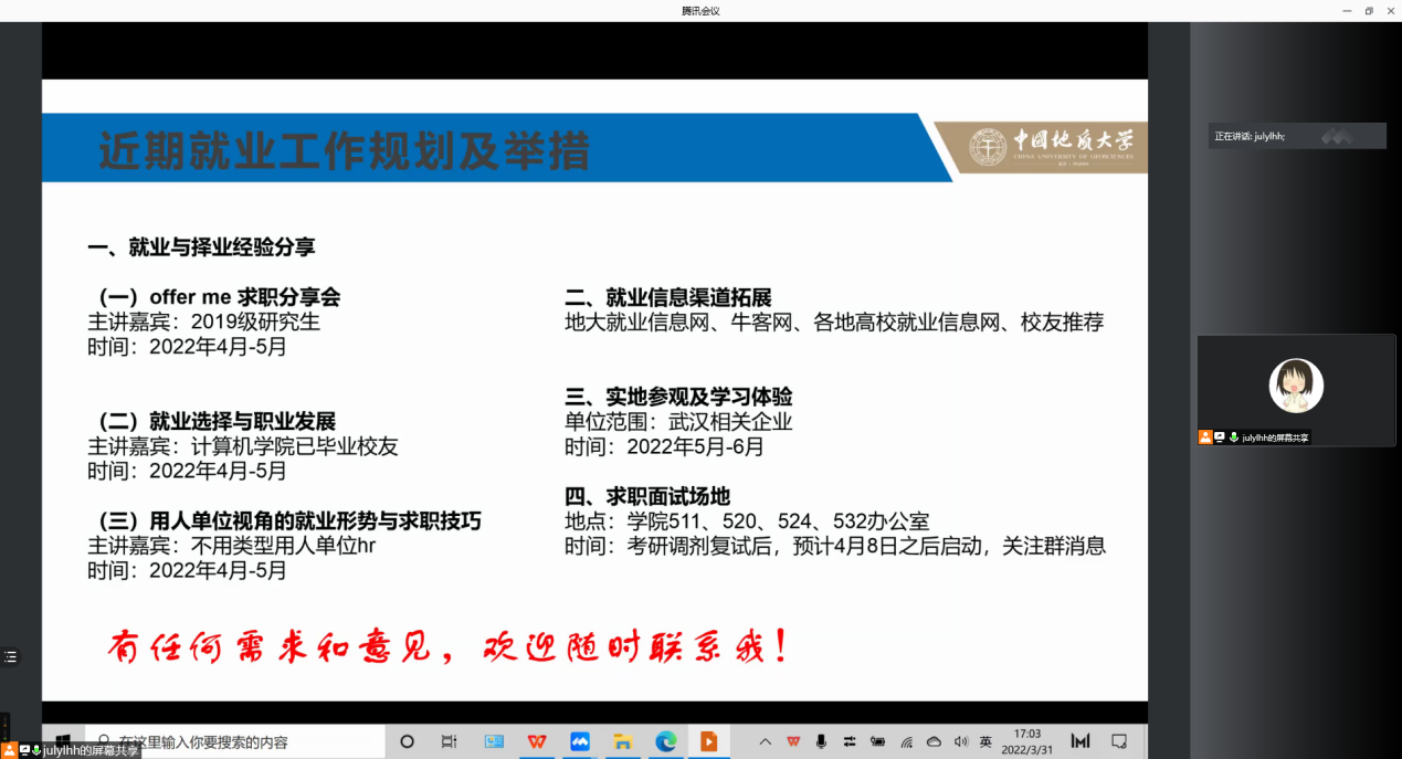 此外,李欢欢就求职就业形势与政策做剖析解读。整理分析学院现有的就业举措,如校友就业经验分享、网站就业信息拓展、实地参观活动预告,以及求职面试场地供给等。同时,针对存在就业疑虑的同学,提供多维度的咨询服务,包括一对一重点推荐、签约解约流程梳理等。