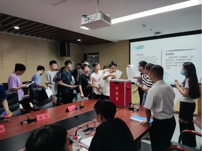 会议第七项,研究生代表填写选票,由总监票人、计票人进行选票统计。