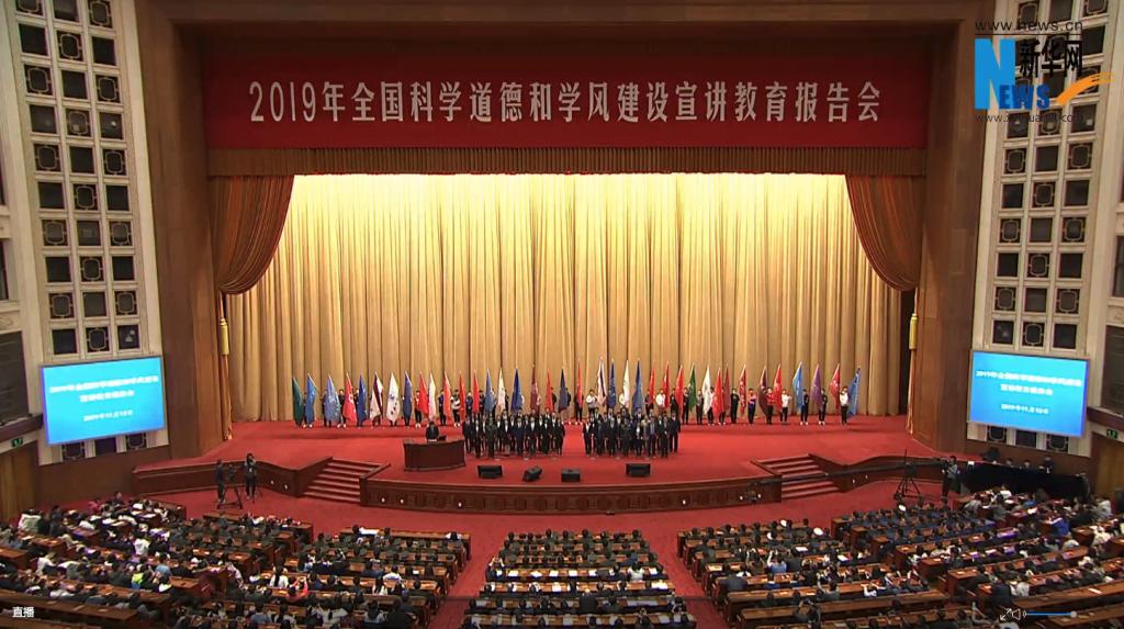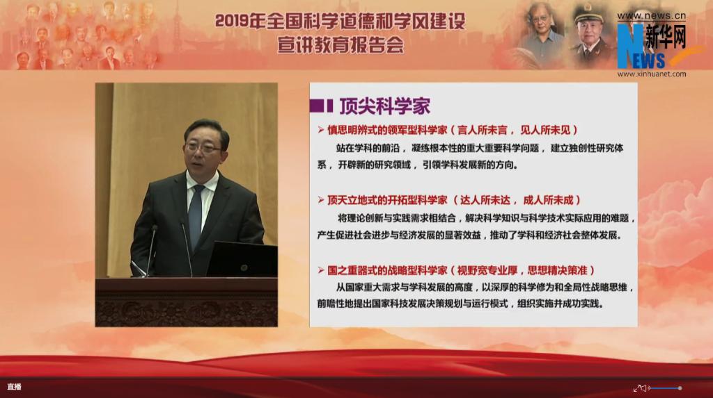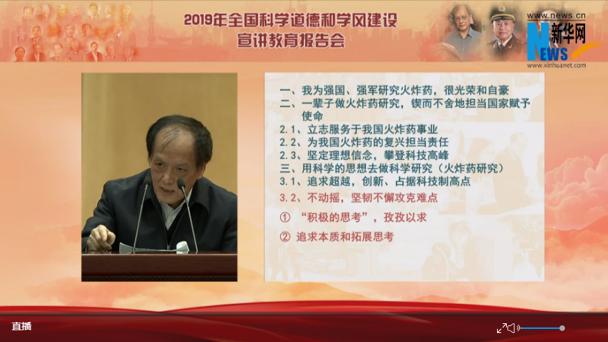 报告会上,中国工程院院士、南京理工大学教授王泽山,中国工程院院士、陆军工程大学教授钱七虎,中国工程院院士、南开大学校长曹雪涛围绕“礼赞共和国 追梦新时代——以习近平新时代中国特色社会主义思想为引领,大力弘扬科学家精神,持续加强科学道德和学风建设”主题作报告。