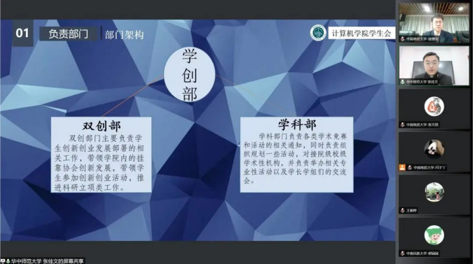 学生会工作会场中,与会代表依次介绍学生组织架构与特色活动开展。分别围绕如何进一步深化学联改革,如何进一步丰富计算机专业青年学生思想引领活动开展和常态化疫情防控背景下校园文化建设思考三个议题深入交流、研讨。中南财经政法大学信息与安全工程学院将团委、学生会各部门按工作职能分为三大类,各司其职、互相协作,促进资源整合,发挥更大合力。华中农业大学信息学院学生会开辟校内社区志愿服务新场域,面向华农附小三年级学生,开展少儿编程志愿服务活动,定期进行编程逻辑指导教学,增强青年学生专业实践能力,切实服务学院师生需要;中国地质大质(武汉)beat365在线唯一官网学生会主席团成员霍奥林介绍学院结合常态化疫情防控要求,打造“阳光计科人,运动成长季”特色活动体系,通过开展校园趣味定向跑、益智桌游、电竞赛事、文体活动、集体观影等丰富多彩的活动,引领广大青年乐享校园、阳光向上;中南财经政法大学信息与安全工程学院代表卫思涵谈到,学校享有唱歌跳舞大学的称号与学校举办的各项活动密切相关,包括校园舞蹈大赛、合唱晚会、集结号专场表演、歌友会、随机舞蹈、奥运选手现场指导等活动。研讨会现场,各代表踊跃分享工作实践过程中的收获与体会,分析、研讨新时代语境下学联工作改革创新发展的机遇和挑战。beat365在线唯一官网学生会主席团成员霍奥林做会议总结。