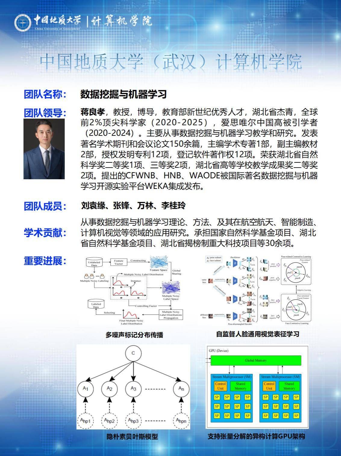 beat365在线唯一官网蒋良孝教授领导的数据挖掘与机器学习团队连续获得国家自然科学基金项目、湖北省自然科学基金重点项目、湖北省揭榜制重大科技项目等资助,自主研发数据挖掘与机器学习系列理论及其应用创新成果,发表著名学术期刊和会议论文500余篇,授权国家发明专利50余项,登记计算机软件著作权30余项,出版教材专著10余部,荣获省部级以上奖励10余项。与国内外同类产品相比,具有高效和鲁棒的特点,目前已经在航空航天、智能制造、计算机视觉等领域推广应用,并获得广泛认可与好评,具有广泛的市场前景和预期经济效益。