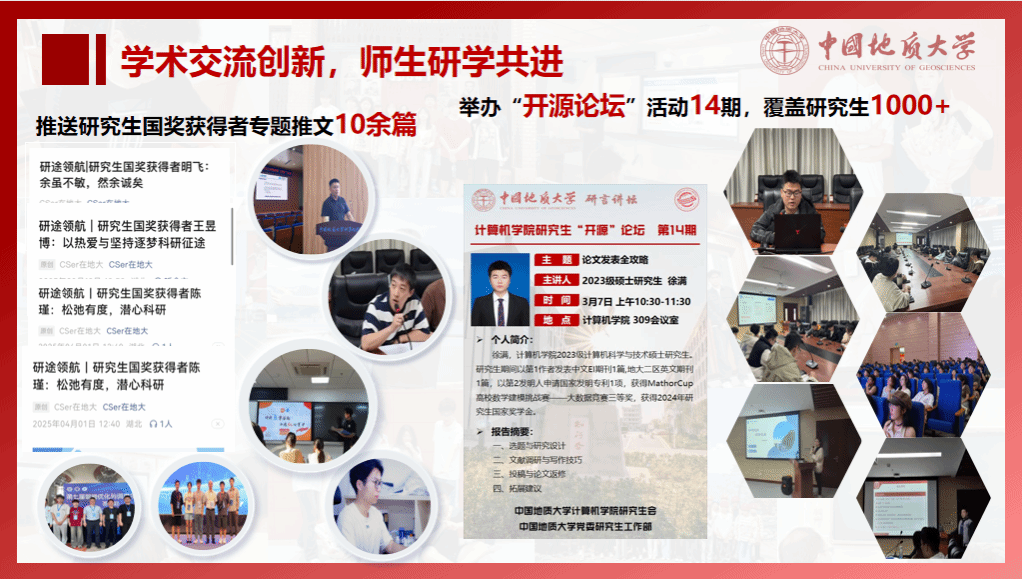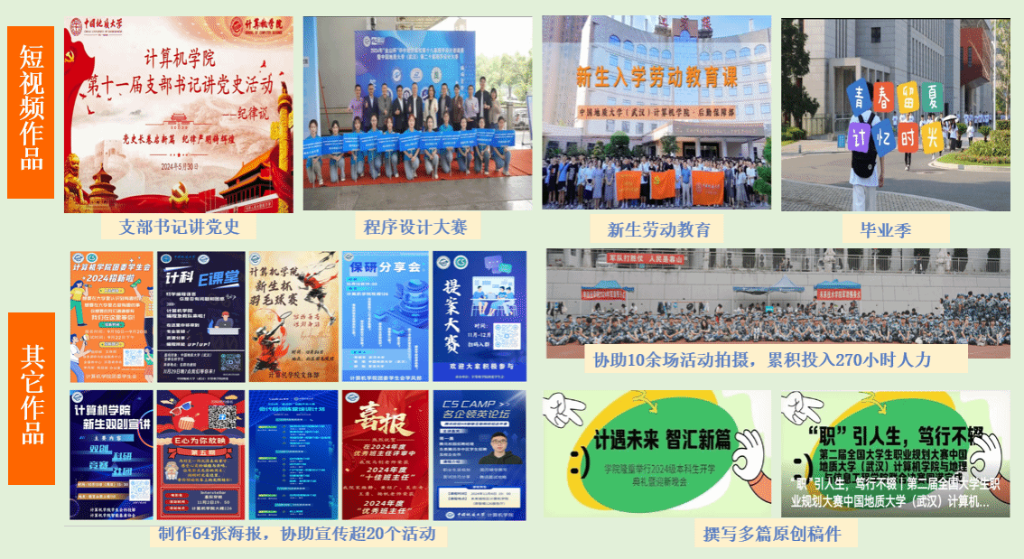 CSer在地大”全年策划推出总推文数400+篇,总阅读数量超36万次,关注人数破万。“地大CS计小软”全年发布说说量700+篇,空间总浏览量近9万次,关注人数破千且持续增高。联动“山河网络工作室”和“后勤保障部”等制作推出《支部书记讲党史》、《新生入学劳动教育课》、《“金山杯”程序设计邀请赛》、《迎新季》、《毕业季》等系列短视频,形成“校-院-人”三级联动传播格局,有效扩大影响力。