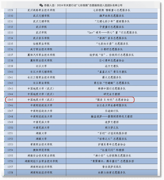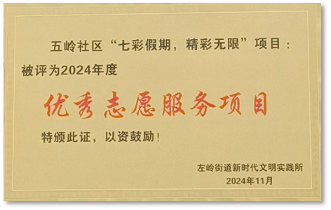 服务E时代志愿者协会获评“2023-2024年度校级十佳大学生志愿服务团队”、团中央与中国青年志愿者协会2024年关爱行动“七彩假期”志愿服务团、“左岭街道2024年度优秀志愿服务项目”、2024年“三下乡”暑期社会实践校级优秀团队、“2024-2025年度校级十佳大学生志愿服务团队”。协会将继续发挥专业优势,积极参与各类志愿活动,深化服务校园、服务社会的工作,为构建更加美好的校园生活和社会环境贡献力量。