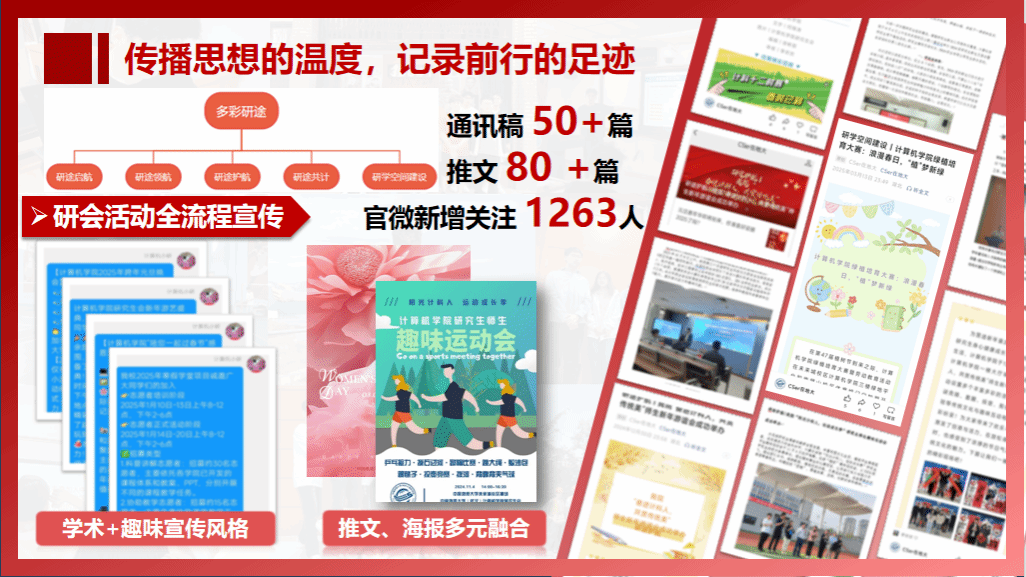 研究生会构建“多彩研途”五维宣传体系,全年拍摄1000多张照片、制作7部精彩视频、撰写50余篇通讯稿,编辑80余篇推文,用心镌刻成长之路,彰显乐学上进的良好风貌。