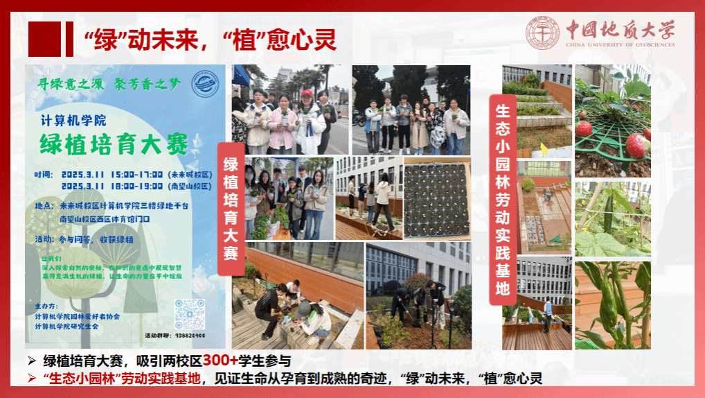 打造“四维”研学空间建设工程,开展“最美研学空间”“最美研究生工位”评选活动;组织40余场求职沙龙活动、协助举办30余场招聘会;建立学院楼内“生态小园林”劳动实践基地、开展绿植培育大赛活动。