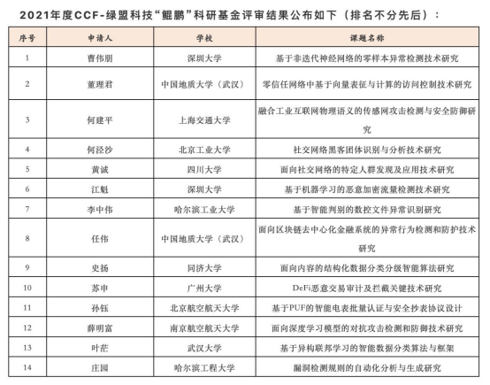 CCF-绿盟科技“鲲鹏”科研基金于2017年由CCF和绿盟科技共同发起,主要面向国内高校、科研机构的研究人员和团队,旨在以小微课题的方式支持科研人员的研究与创新,推动科研技术成果转化,促进外部科研机构优秀研发能力与企业产品价值的深度融合,构建互动合作与创新发展的生态圈。