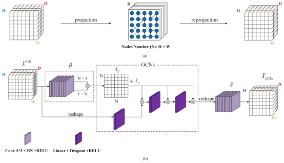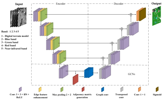 针对上述问题,本研究构建了一个矿区精细占地类型遥感智能解译框架模型(EG-UNet),该模型在增强矿山占地特征的同时,能够捕获其长距离信息。该框架包括两个主要模块:1)边缘特征增强模块。矿山占地边缘相较于空间位置,包含更关键的遥感图像敏感信息。因此,本研究在特征提取过程中,基于权重矩阵对边缘进行特征增强,进而更好地保留这些特征;2长距离特征提取模块。构建长距离特征提取模块,有助于获取矿山占地小面积图斑特征。本研究通过图卷积网络来捕获长距离特征,并应用卷积神经网络来学习图的构造。