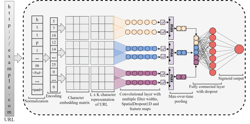 为了应对这些挑战,该论文提出了CNN-Fusion,这是一种基于字符级卷积神经网络(CNN)的有效且轻量级的钓鱼网站检测方法,它从原始URL中提取多级特征,而不需要一些专业领域知识或任何第三方服务来帮助检测恶意的URL地址。该论文的基本想法是并行部署多个具有不同大小内核的单层CNN变体,以提取多级特征。相比于具有固定内核大小的多个顺序层,具有不同内核大小的单层CNN能更有效地捕捉文本模式,这是由于不同的内核宽度可以检测输入URL中的不同模式。例如,一个小的内核可以检测局部模式,但一个较大的内核却可以检测全局模式。该模型采用了被证明在正则化方面非常有效的SpatialDropout1D,并利用了时序最大池化操作,显著提高了其鲁棒性和整体性能。 下图描绘了该模型的整体架构。