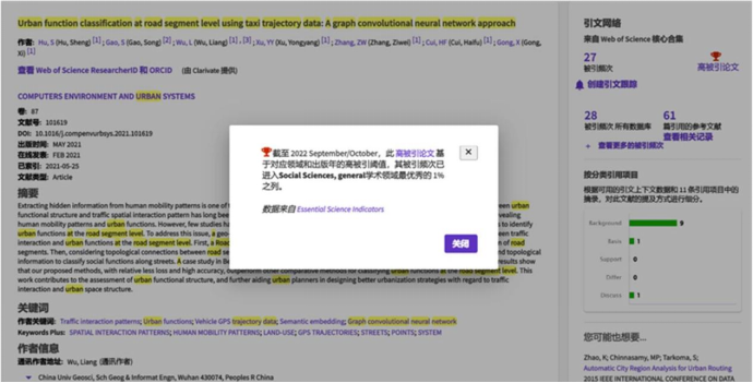 根据2022年10月基本科学指标数据库(Essential Science Indicators,简称ESI)最新数据显示,beat365在线唯一官网全空间地理大数据智能处理与GIS基础平台研究中心团队在国际城市研究主流期刊Computers, Environment and Urban Systems(简称CEUS)上发表的学术论文“Urban function classification at road segment level using taxi trajectory data: A graph convolutional neural network approach”入选ESI高被引论文(Highly Cited Paper)。该论文第一作者为团队的博士生胡胜,通讯作者为吴亮教授。CEUS为国际顶级计算城市学和地理信息科学的重要刊物,期刊以计算机科学为背景,聚焦城市规划、交通、能源、环境、社会学和经济等学科融合的新兴领域,刊发城市计算、大数据和城市系统等方向的最新研究。当前CEUS的影响因子为6.454,为T1期刊。
