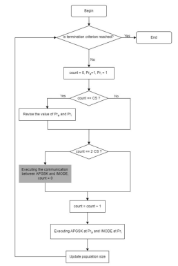本文作者认为,在APGSK-IMODE算法中,两个组成算法APGSK和IMODE的信息交流方式存在缺陷,交互效率不高。经过研究,提出了基于个体适应值以及寿命进行交流的组合型算法APGSK-IMODE-FL。当需要信息交流的时候,两个组成算法寻找自己存在代数超过阈值,且适应值排名落后的个体进行交换。如果未找到,则两个组成算法则按照以前的策略,共享最好的个体。