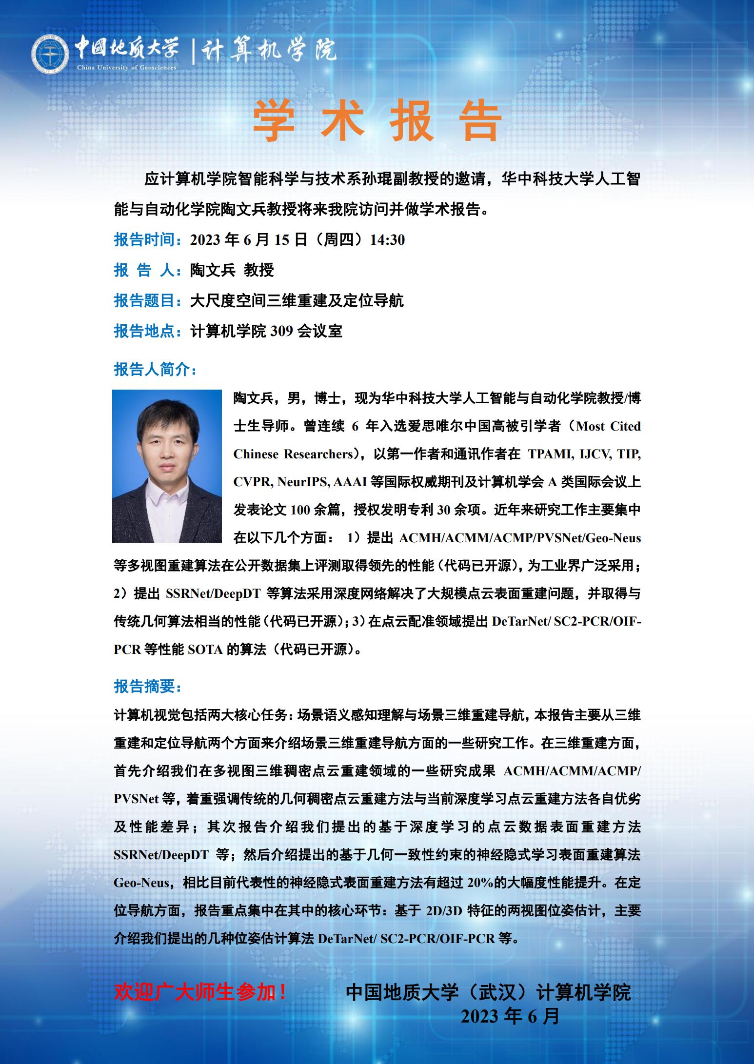 学术报告:华中科技大学陶文兵教授——大尺度空间三维重建及定位导航