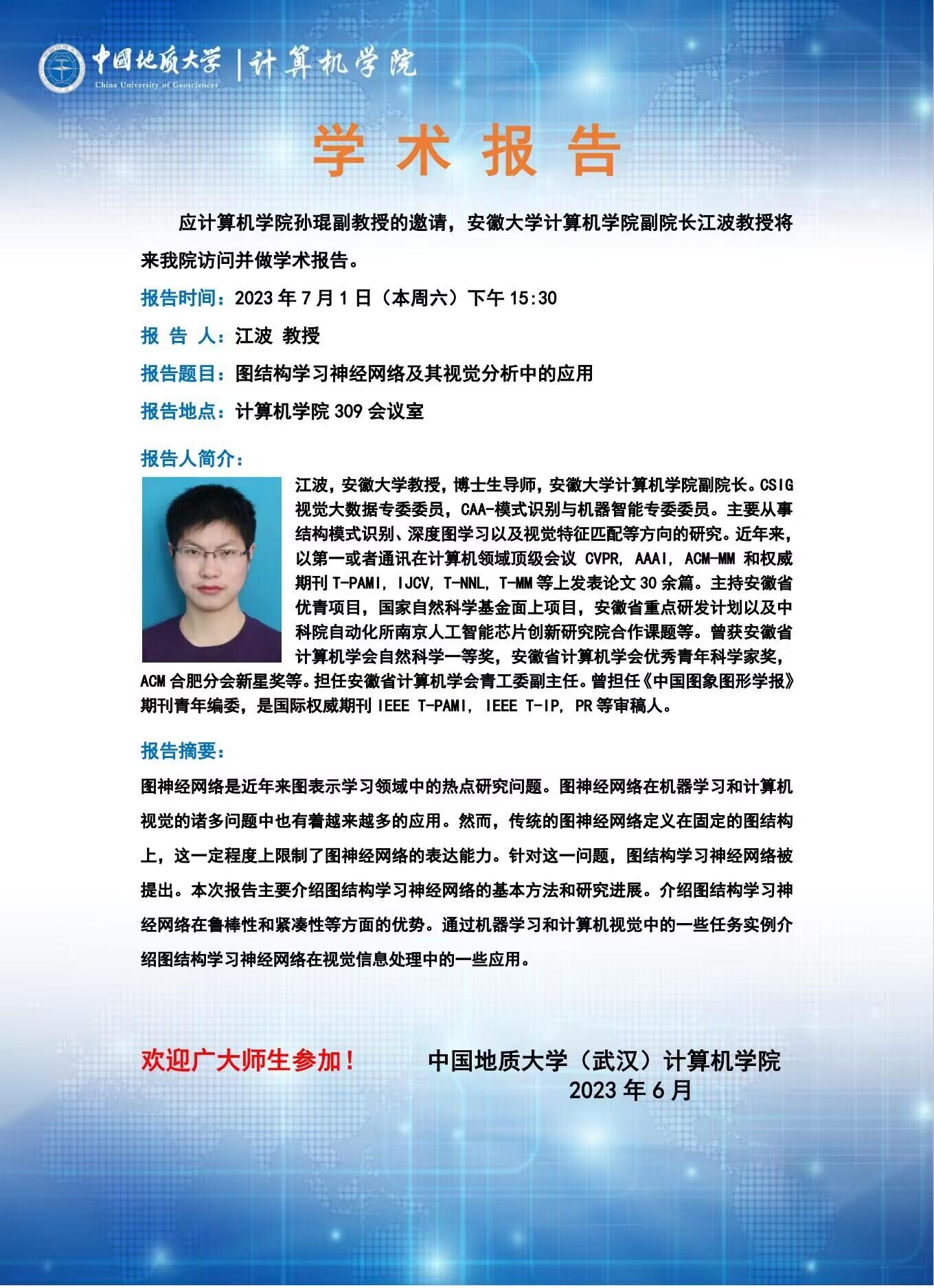 学术报告:安徽大学beat365在线唯一官网副院长江波教授——图结构学习神经网络及其视觉分析中的应用